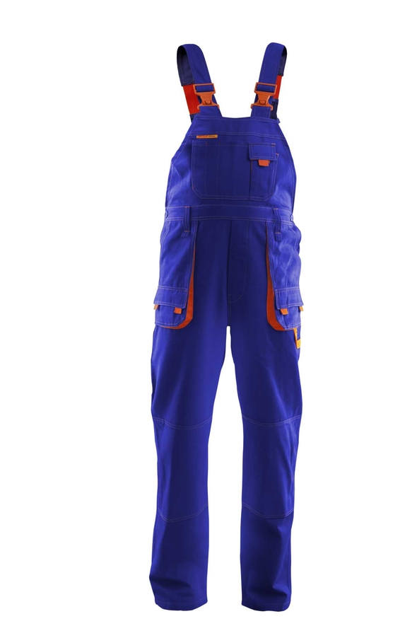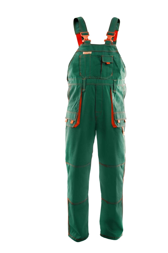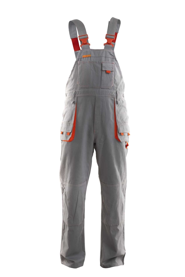 długie, szerokie, regulowane szelki, spodnie posiadają szlufki na pasek, przestrzenne kieszenie, dwie kieszenie boczne, wzmocnione kieszenie zapinane na rzepy, kieszeń na komórkę, dwie kieszonki na długopisy, kieszeń na dokumenty, kieszeń na miarkę „metrówkę”, szlufka na młotek, ergonomiczna kieszeń na nakolanniki, podwójne szwy, szyte widoczną, mocną nicią, wykonana z wysokiej jakości materiału, który zapewnia po wielokrotnym praniu stabilność rozmiarów,